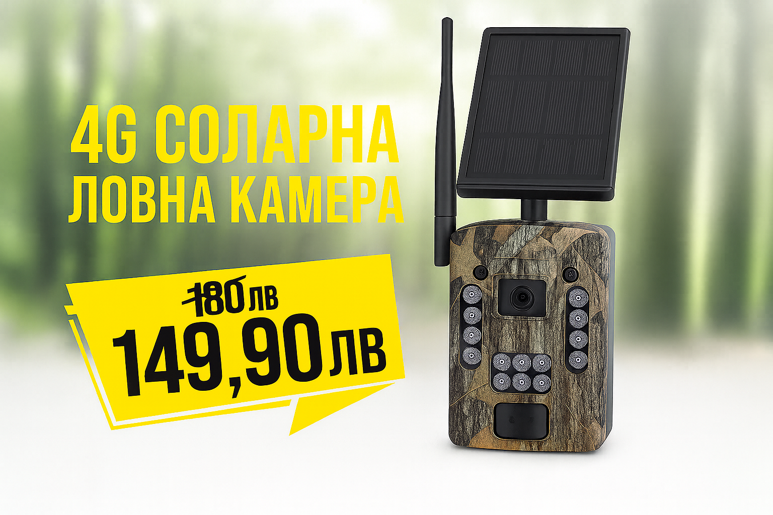 Издръжлива ловна камера с 4G връзка и соларен панел, идеална за наблюдение на дивата природа, ловни терени, пчелини, ферми и вилни имоти. Камуфлажен дизайн за незабележимо монтиране, заснемане денем и нощем, с възможност за дистанционен достъп през мобилно приложение. Сега на промо цена от 149,90 лв (стара цена: 180 лв)!