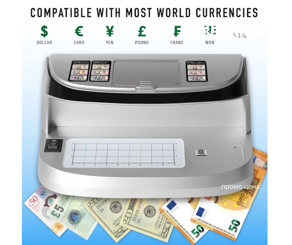 Преносимото устройство е компактно, издръжливо и леко, подходящо да го вземете със себе си при следващата си командировка или събитие. Работи с всички валути в света.